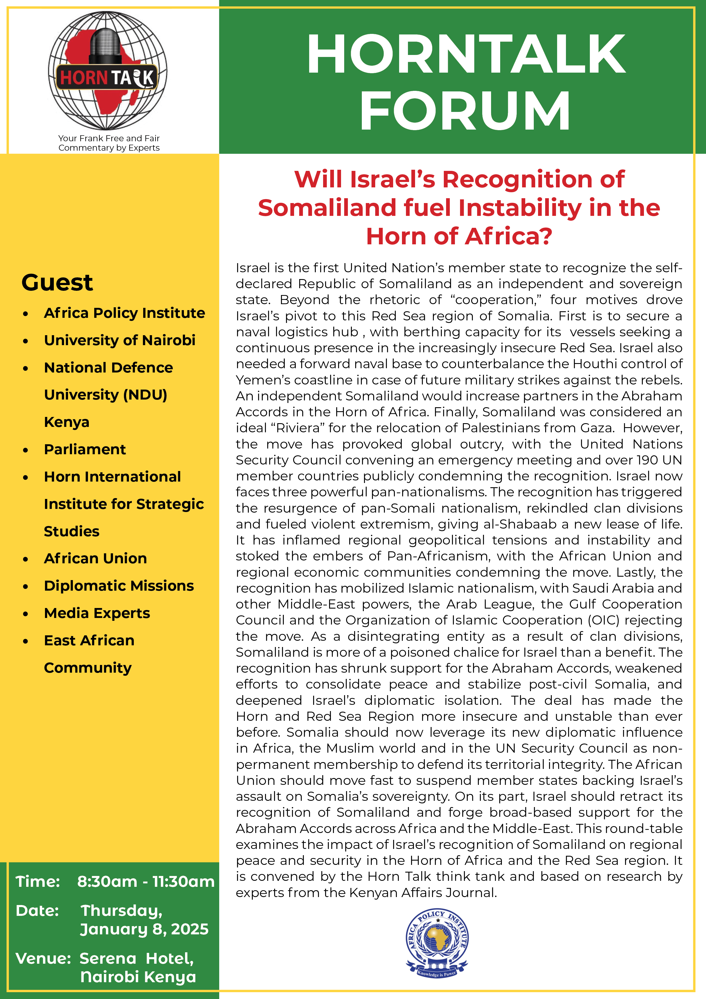 HornTalk, under the Africa Policy Institute, recently convened a high-level forum led by Professor Peter Kagwanja to debate whether Israel’s recognition of Somaliland could destabilize the Horn of Africa. The panel featured prominent voices including Hon. Yusuf Hassan, Dr. Mustafa Ali, Dr. Kenneth Ombongi, Amb. Erastus J.O. Mwencha, Dr. Mumo Nzau, and Barack Odour, reflecting diverse perspectives on the geopolitical, security, and economic implications of this development. The mainstream media were keen to capture and publish articles on the forum.